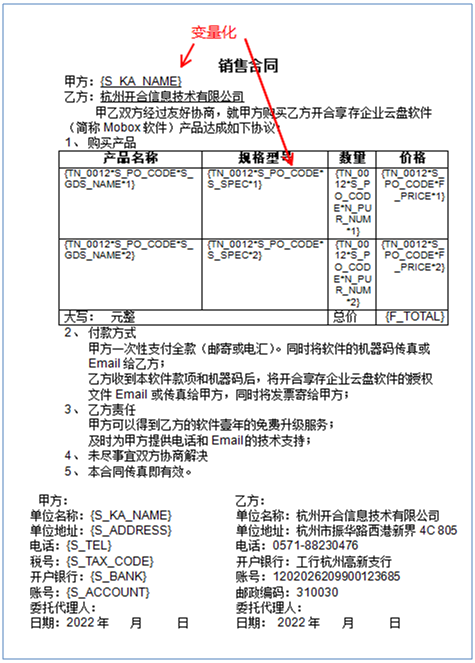- 我們利用企業(yè)現(xiàn)有的合同模版,對里面的:甲方、乙方、采購清單、單價、總價等內(nèi)容先變量化。我們稱之為:格式化合同模版