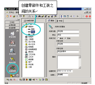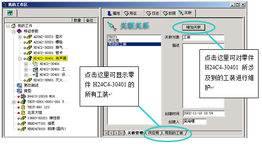 ? ? ? 當(dāng)設(shè)計(jì)人員完成了一個(gè)零部件的設(shè)計(jì)后,其它管理人員可以在”共好”上完善該零部件和工裝等管理信息之間的關(guān)聯(lián)關(guān)系,見下圖: